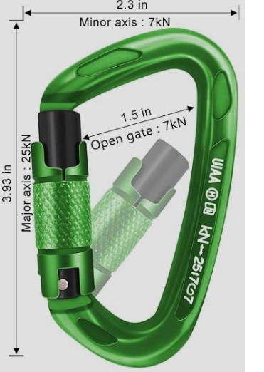 A locking carabiner to attach the anchor to the rope is available for $12. This is the efficient and quick way to attach the longyi rope to the hinge anchor (or a floating ring for group longyi; see pictures). Only the green color is available.